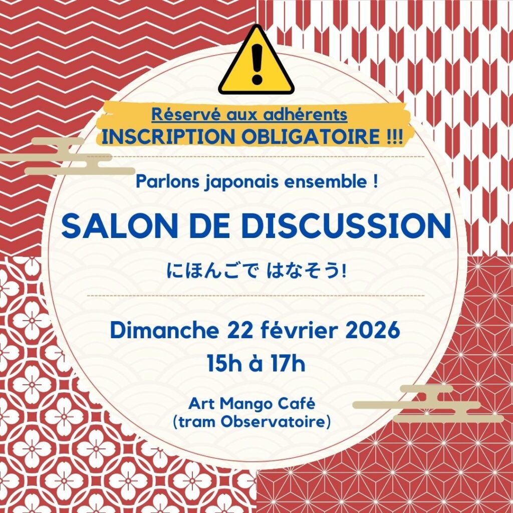 ⚠️ Attention : il ne s’agit pas d’un cours de japonais, et toutes les discussions auront lieu en japonais. Vous devez donc être capables d’échanger quelques phrases en japonais, même très simples.