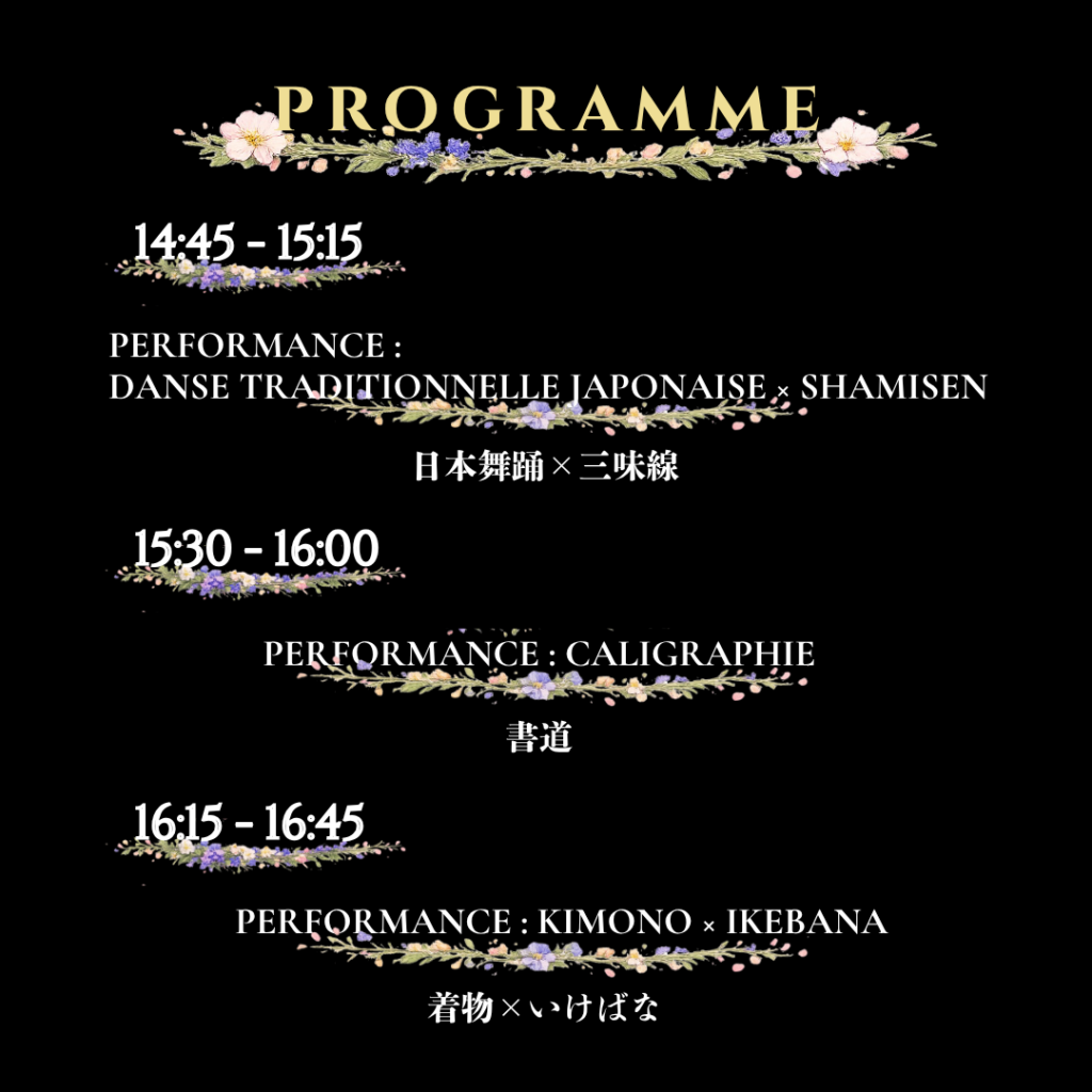 Performances Danse japonaise – Ribo Shamisen – Romain Butô – Ippei Calligraphie – Saki Ikebana – Marina et ses élèves de l’école Kidō Mishōryū